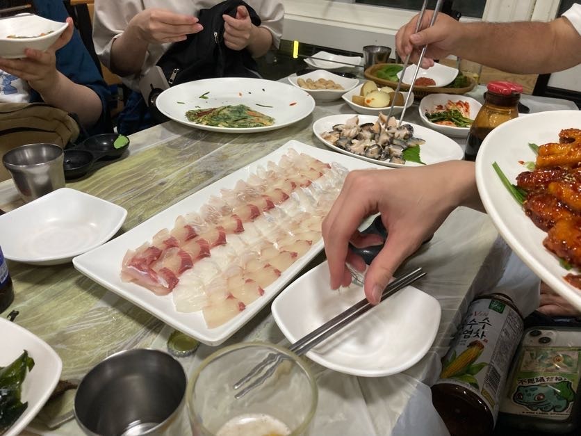 夕食のタコ、ホルモン、エビなどを混ぜた「ナッコプセ」は辛かったですが絶品でした!